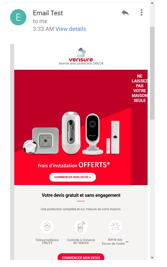 Sur plus de 25 critères analysés, nous vous recommandons de retravailler un peu la partie technique notamment au niveau des images étirées sur Outlook, de faire attention à la partie responsive, sur Gmail, l'e-mail ne passe pas en responsive mais reste à la version desktop. Notamment car Gmail est la première messagerie en france.